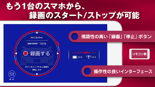 ・フロント側から、リア側のスマートフォンの録画がリモートスタートできます(リモートスタート機能をご使用の際は、前後2台のスマートフォン両方に本アプリをインストールしてください)