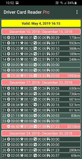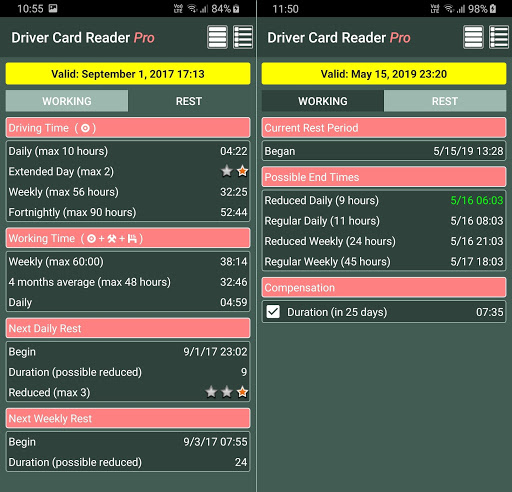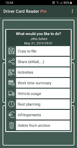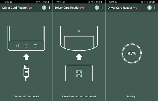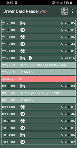 This app is designed for professional truck drivers. With this application you can read the digital tachograph driver card. You can share data in different ways or store it on your device in different standard formats (ddd, esm, tgd, c1b). The read time will be written back to the card and the application reminds you of the 28-day read obligations.
