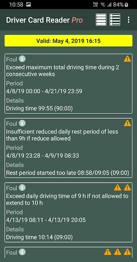 The application analyzes the data on the driver card and shows you the infringements in driving and rest periods. You can get a detailed list of driver activities and a shift / weekly / monthly work summary. We can help you plan your working/rest time.