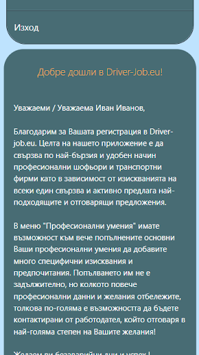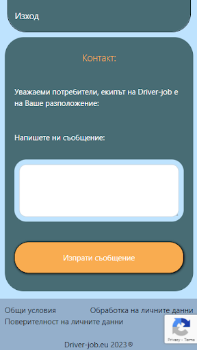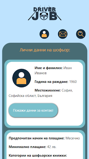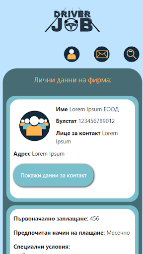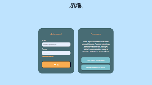 Driver-job.eu is a platform for finding job offers or finding employees. The application is created for truck drivers and for companies where both groups can meet and communicate. One can register as a driver or as a company. This will allow you to communicate with the other group respectively through the platform that we provide. In this way one can find a company that can provide a job for you or a truck driver who meets your requirements. The application provides the possibility of filtering users and communicating with them.