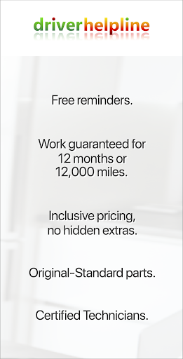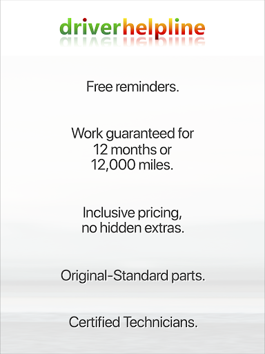 We want to help you keep your vehicle safe and legal by sending you free notifications, then allowing you to book great value services quickly and conveniently using the driverhelpline app.