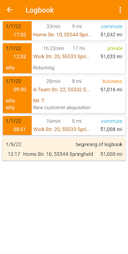 This app is a logbook and determines the most probable details for your next journey from your previous entries. At the end of the journey, you only have to check and confirm.