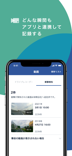 ・動画:事故による強い衝撃を検知した場合に、映像(衝撃検知前10秒、後5秒)が自動的に損保ジャパンに連携されます。強い衝撃が発生しないような事故の場合、専用スマホアプリから映像をダウンロードし、損保ジャパンへ送信することが可能です。