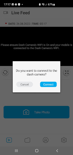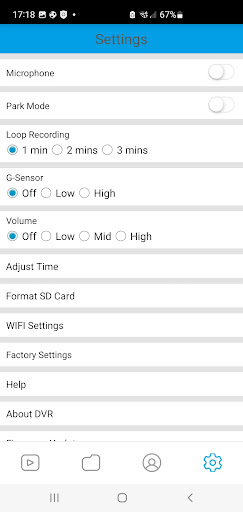 Once connected you can access all the videos recorded by your dashcam stored on the micro SD Card which you can play back on your smartphone . There is also a Live View mode to check the alignment of the dashcam and the dashcam settings are controlled via the settings menu in the app.