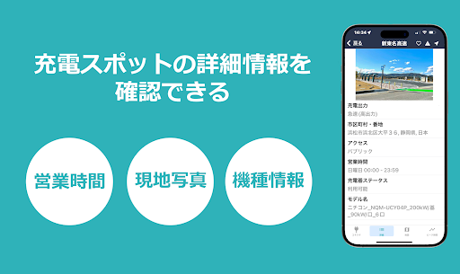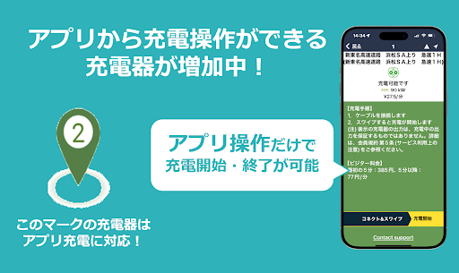 e-Mobility Powerネットワーク(旧NCSネットワーク※1)に連携した急速・普通充電器の充電スポットの検索、満空情報等を確認いただけるだけではなく、本アプリから入会することで、様々な会員サービスをご利用いただけるようになります。