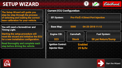 The E Tuner 4 Setup Wizard simplifies your Pro Flo 4 EFI setup by assisting you with selecting the proper base calibration for your specific application. All you need to know is the engine displacement (CID) and camshaft, and kit specifications, and you’re good to go!