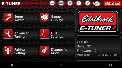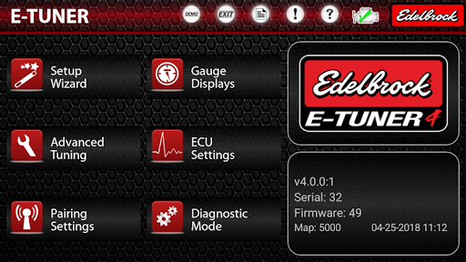 You can also preview E-Tuner 4 without being connected to an Edelbrock EFI System by enabling “Demo Mode.” This will allow you to access the app’s main features, and interact with pages like the Setup Wizard, Advanced Tuning, and Gauge Displays to get a feel for how E-Tuner 4 functions.