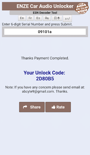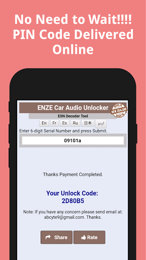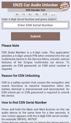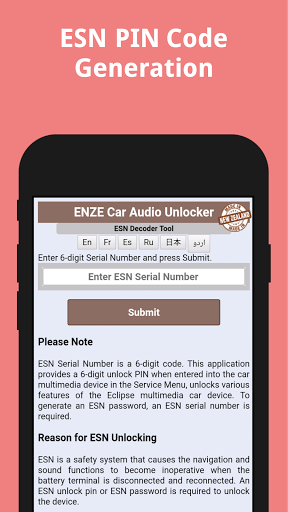 This application could be used to generate a 6-digit unlock PIN when entered into the car multimedia device at ESN Pin screen, could unlock various features of the Car Audio Unit.