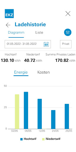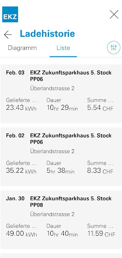 Eine Übersicht: Alle Ihre privaten und öffentlichen Ladevorgänge sind übersichtlich in der Ladehistorie in der EKZ Lade-App einsehbar.