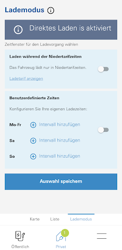 Es stehen Ihnen zwei Lademodi zur Auswahl. Öffnen Sie die EKZ Lade-App und klicken Sie im Bereich “Privat” auf den Reiter “Lademodus” um die folgenden Präferenzen zu aktivieren: