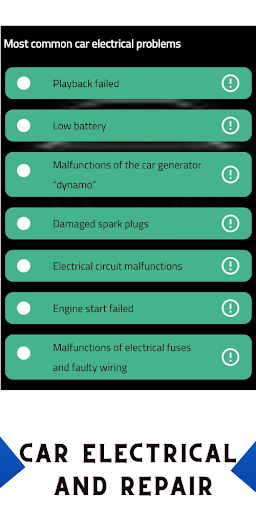 Our electrical repair for cars application presents the common causes and signs that cause problems in the car’s electrical and provides how to deal with each of them and explains the reasons in detail.