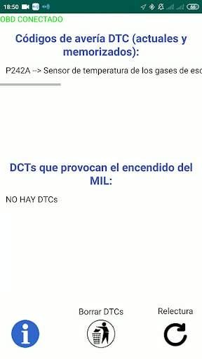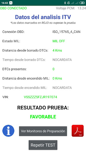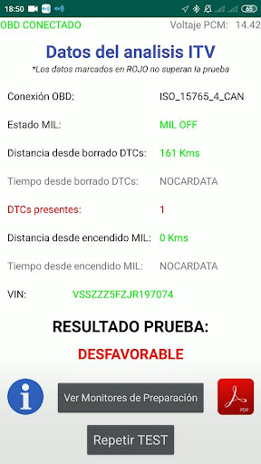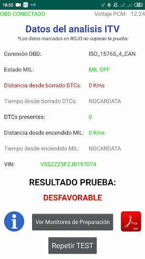 The application will show you if the vehicle passes this test, and if not, the reasons and / or faults codes present in the control unit that cause an unfavorable result.