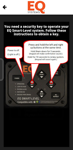 Bluetooth remote control for operating a Bluetooth enabled EQ Smart-Level vehicle leveling system by EQ Systems.