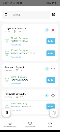 Aplikacja umożliwia wyszukanie stacji ładowania znajdujących się w pobliżu. Możesz również wyszukać według miasta, kodu pocztowego lub numeru stacji ładowania. Na liście wyszukiwania znajduje się zestawienie dostępnych stacji ładowania i odległość do nich.