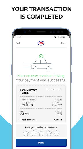 • At the end of your filling, the app uses your Esso Card onboarded in the app for payment and presents the receipt with all details.