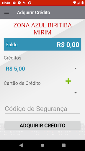 Depois do cadastro efetuado, o usuário poderá adquirir créditos para compra dos e-Tíquetes, utilizando seu cartão crédito ou débito. No APP poderá visualizar o histórico das aquisição de crédito realizadas no EstacionamentoFacil, além de ter sempre a mão seu Saldo para compra de novos e-Tíquetes.