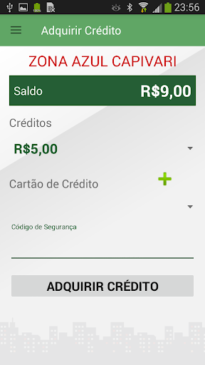 Depois do cadastro efetuado, o usuário poderá adquirir créditos para compra dos e-Tíquetes, utilizando seu cartão crédito ou débito. No APP poderá visualizar o histórico das aquisição de crédito realizadas no EstacionamentoFacil, além de ter sempre a mão seu Saldo para compra de novos e-Tíquetes.