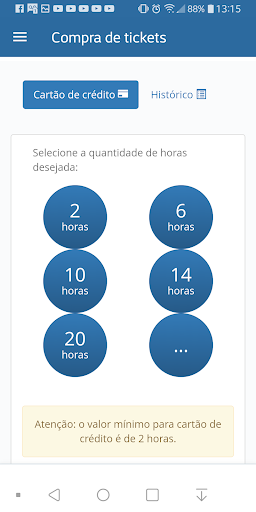 Acesse o menu lateral e escolha a opção Compra de Tickets. Selecione a quantidade de horas e efetue a compra com cartão de crédito.