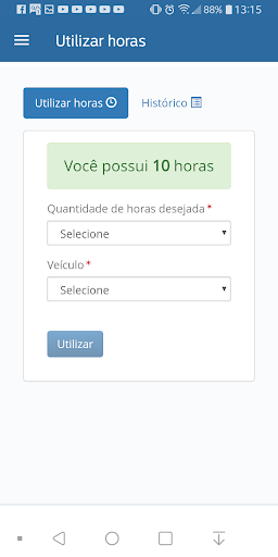 Acesse o menu lateral e escolha a opção Histórico de Utilização de Hora. Um comprovante da utilização é inserido no histórico e fica a disposição do usuário para consulta e acompanhamento.