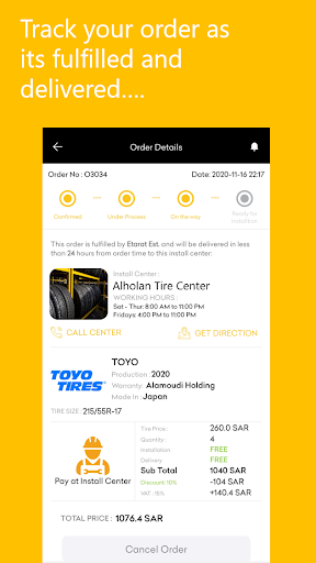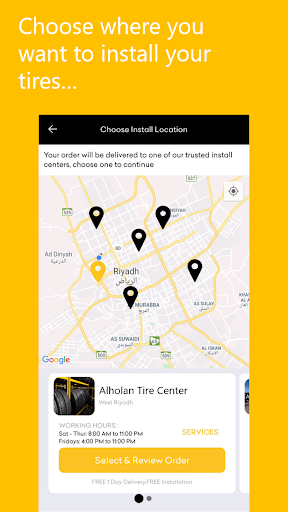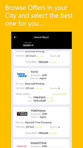 Estbnh App helps you find the best tires for your car at the best price. Simply enter the tire size you need and Estbnh will show you the latest offers from tire providers in your city. Pick a tire and have it delivered to one of our approved install centers near you, where you can go and install your brand-new tires.