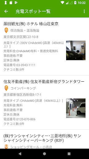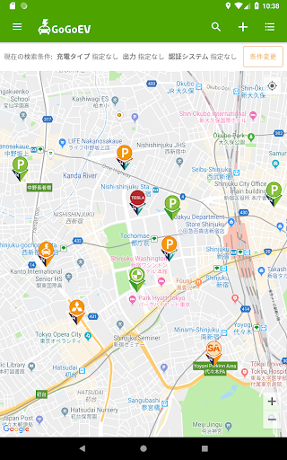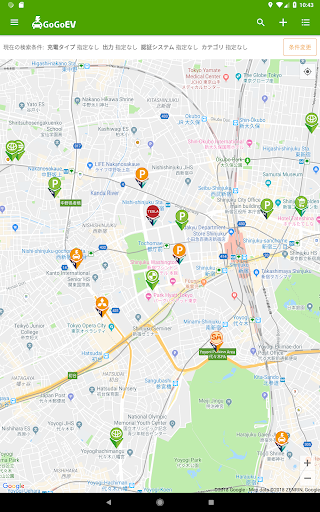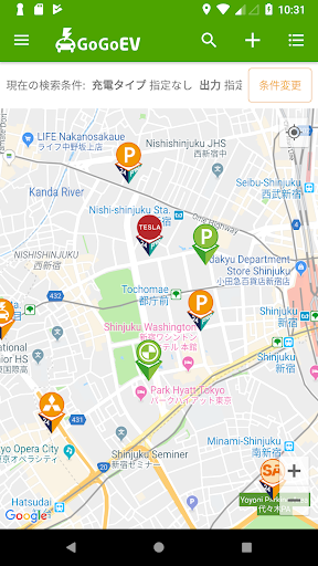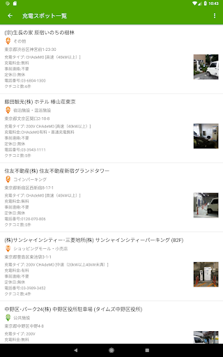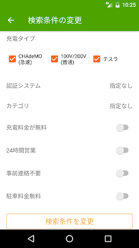 充電が無料でできるスポット、24時間充電可能なスポット、駐車料金が無料の充電スポット、急速充電(CHAdeMO)可能なスポットの検索ができます。