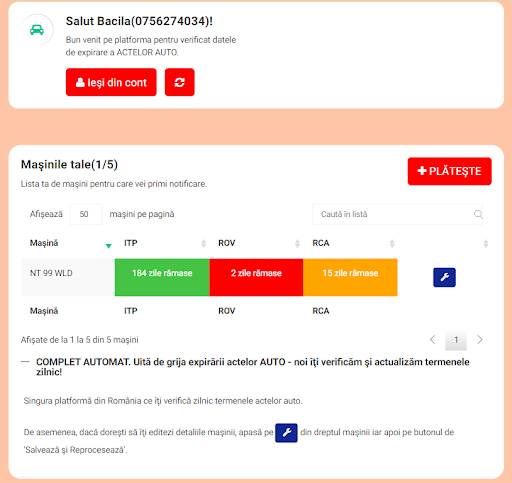 Notificările se fac cu 15 zile înainte, 2 zile înainte şi în ziua expirării pentru ITP, RCA şi Licenţa de Transport(doar pentru transportatori).