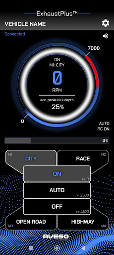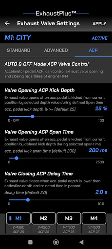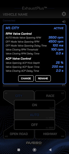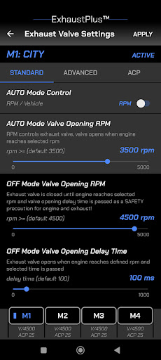It supports three working modes ON, OFF and AUTO that are adjustable through ExhaustPlus Smartphone App and stored in four memories for different driving conditions.