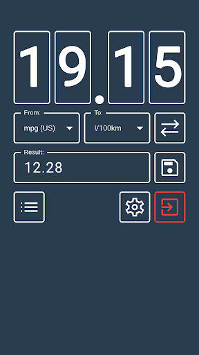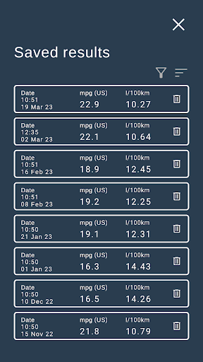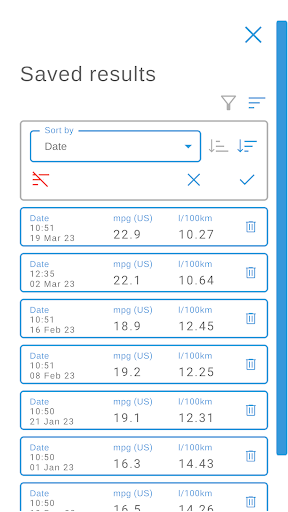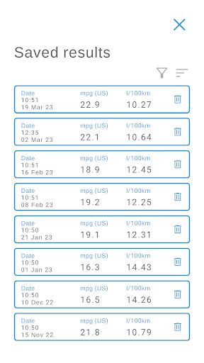 You can also save the results to a list for easy fuel consumption tracking with the ability to sort and filter saved data.