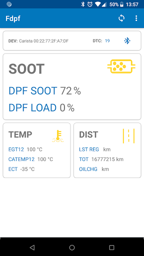 Fdpf displays information about the percentage of soot in the DPF. The application only supports Ford cars EURO5 – EURO6.2 standard. You must have an ELM327 Bluetooth adapter for operation. Depending on the PCM version and engine type, the parameters may not be displayed. Fdpf also allows you to read diagnostic trouble codes from the PCM. The application is in the early stages of production. It does not guarantee its proper operation.