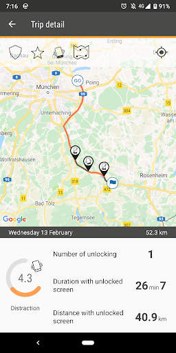 The app runs in the background and automatically detects the beginning and end of a ride. As a result, no manipulation with the smartphone must be made while driving.