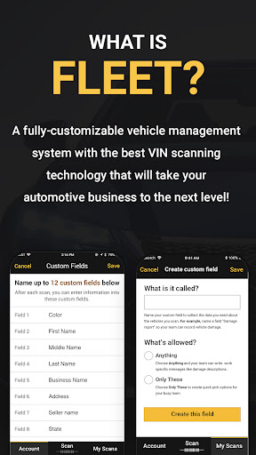 FLEET is powered by Capture, the industry’s leading VIN barcode scanning technology. Capture works in low light, high glare and all lighting conditions. Sync scans across devices on most smartphones and tablets (and there’s a desktop app, too!). Scan VIN barcodes to decode VIN, year, make, model, trim and approximate GPS location.