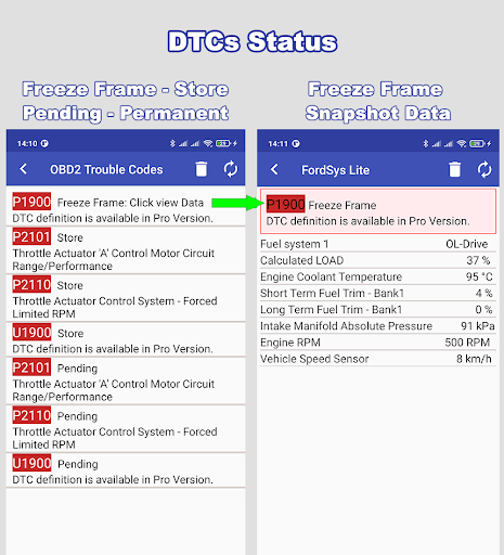 – Build-in DTCs database with over 10000 trouble codes of Ford manufacturer specific codes