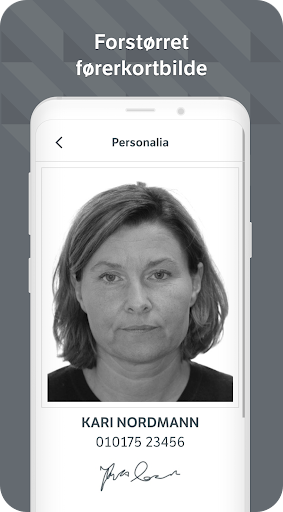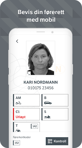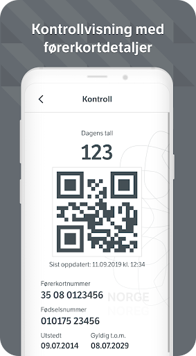 – kontrollvisning som brukes om du blir stoppet i kontroll, med førerkortnummer og gyldighet på førerkortet, samt sikkerhetselementer som QR-kode og dagens tall.