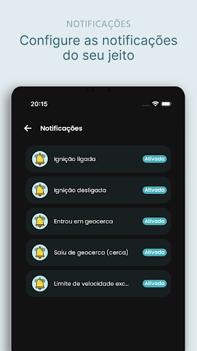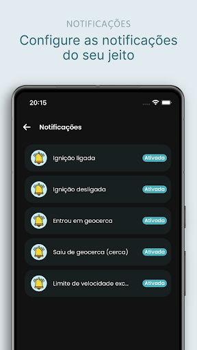 Permite ativar notificação de ignição para saber em tempo real quando seus veículos são ligados ou desligados.