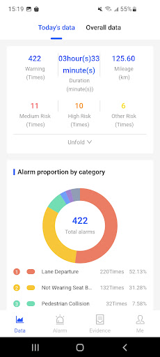 I. Drivers can log in to the app through the login page for drivers. They can use the main functions including viewing the daily driving records under Data, viewing the driving risk event records under Alarm, and viewing and editing the surveillance videos generated by vehicles in the past certain period of time under Evidence.