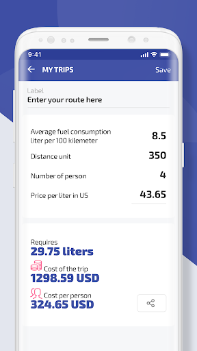 In this app, you have to enter such information as average fuel consumption, the distance you are planning to travel and the price of fuel. The calculator will give you total cost of the fuel required for the whole journey.