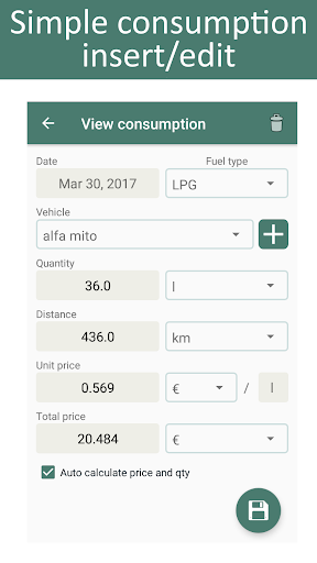 Adding a consumption is very simple: insert distance, quantity, single or total price and the app will calculate automatically the other fields.