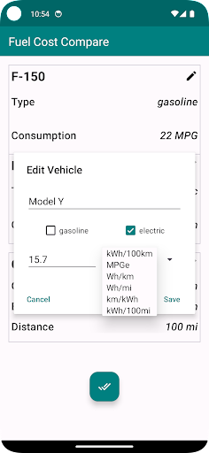 Specify gasoline and electricity prices to get accurate fuel cost calculations for any distance traveled.