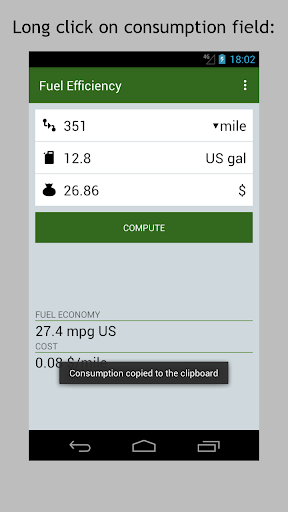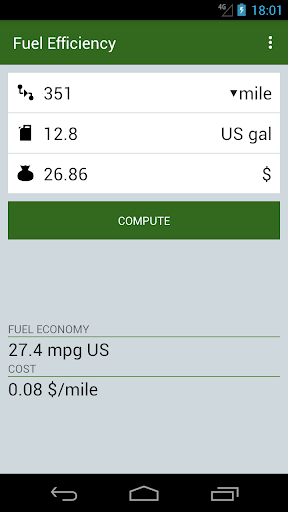 Fuel Efficiency computes your car’s fuel consumption and the cost per mile.