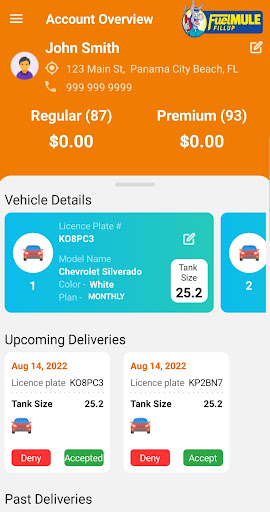These days you can have nearly anything delivered directly to you. Groceries, pizza, furniture, clothes, and so much more. So, why not fuel delivery? We have the solution for you! Fuel Mule Fillup puts the gas station on wheels and delivers fuel straight to your vehicle. Whether it is your personal vehicle, or you own a fleet of vehicles, we’ll keep your tanks full year-round. No more last minute, “1 mile till empty” trips. By signing up for one of our subscription plans, you will be placed on one of our twice-weekly refueling routes. Using our app, you will be able to approve which delivery days you would like to receive fuel. Running on E? Click approve and we will have your tank filled that night. Still have 300 miles of driving range? No worries. Just click deny and we’ll see you next time. With Fuel Mule Fillup, we make it convenient for you. Routes run overnight so you don’t have to worry about slicing time out of your busy schedule. We’ll fill your tank during your downtime. Less time on the road and more time at home. Download our app today to say goodbye to the gas station and hello to Fuel Mule Fillup!