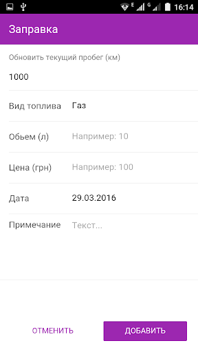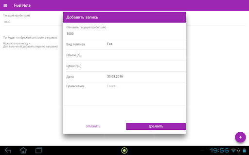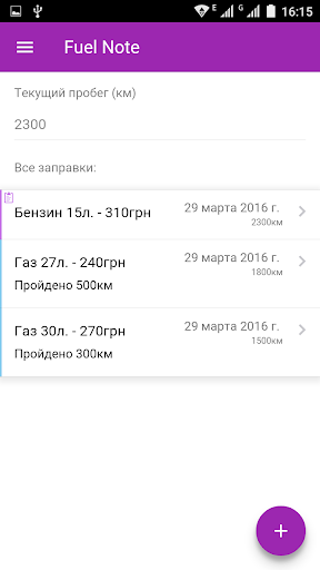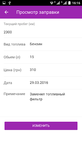 Приложение дает возможность записывать и вести статистику заправленного топлива, стоимости и пройденного километража.