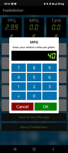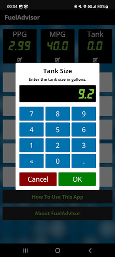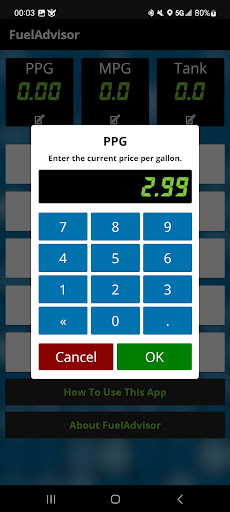 Based on the cost of gas you enter (PPG or Price Per Gallon), your vehicle’s fuel efficiency rating (MPG or Miles Per Gallon) and the tank size on your vehicle (in gallons), you can learn ALL of the following with FuelAdvisor: