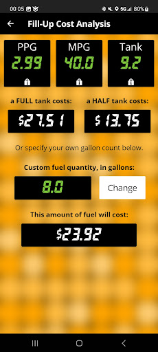 ● How much a fill-up (or a half fill-up) of gas will cost you, or how much it will cost for any number of gallons you’re curious about, perhaps on a rental vehicle