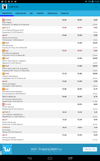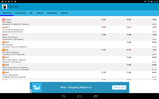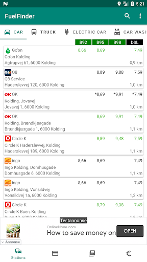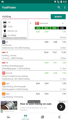 Based on location, the nearest stations for passenger car, truck, electric car and car wash are located in Denmark, Sweden or Norway. The list is shown with the prices available and the distance to the gas station for passenger cars. It is possible to enter new prices for gas stations. If a station is selected for a passenger car, truck, electric car or car wash, a route guide will be displayed. The same functionality is obtained by using the search function.