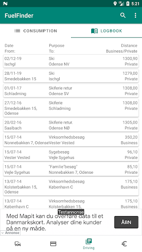 In the consumption and driving book it is possible to register the consumption of fuels on one or more cars, and to keep a logbook with private and commercial driving. Data can be exported by mail.