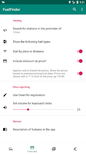 There is a detailed description on the website: https://www.fuelfinder.dk/latest_manual_us.html, which mentions functionality, different settings, etc.