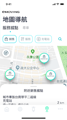 打開APP馬上顯示出最近的充、換電站與eMOVING維修據點,並記錄您的停車地點,您不用再機車海裡撈車,讓您的移動與旅程超便利,路途一路順暢。