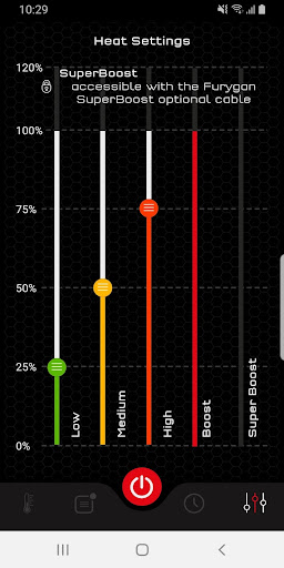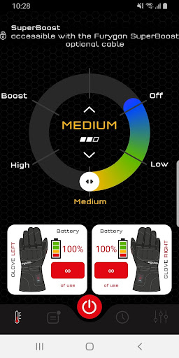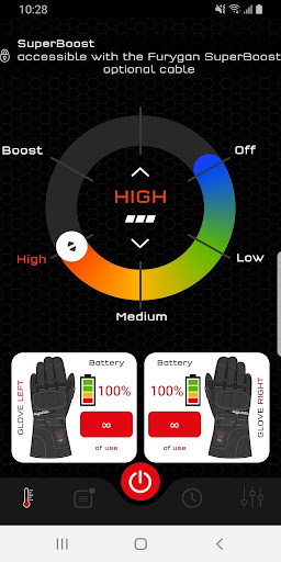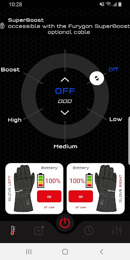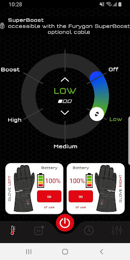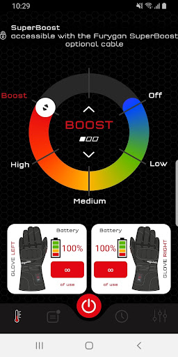 With the main screen, choose the heating mode in one movement: Low, Medium, High, Boost or Super Boost*. Directly visualize the battery life of your gloves according to the chosen mode.