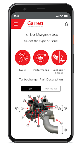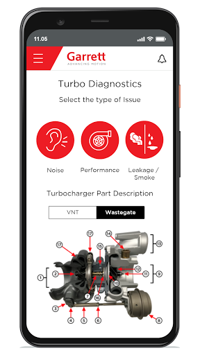 Using Garrett Turbo Diagnostics tool you will be guided through a series of tests and potential issues to uncover malfunctions and you’ll receive the suggested actions. You can generate your own report and save it as a PDF file on your device.