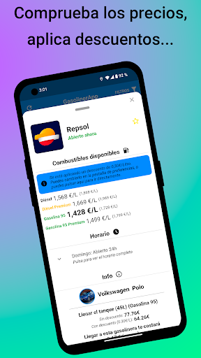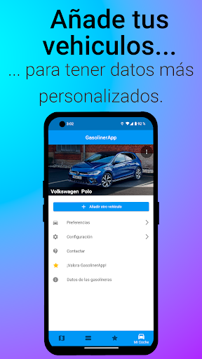 Añade tus vehículos con el tipo de combustible que usan, capacidad del tanque y consumo para ver información como cuanto te costaría llenar el tanque en una gasolinera, cuanto te costaría llegar hasta ella, aplicar descuentos a los precios de los combustibles.